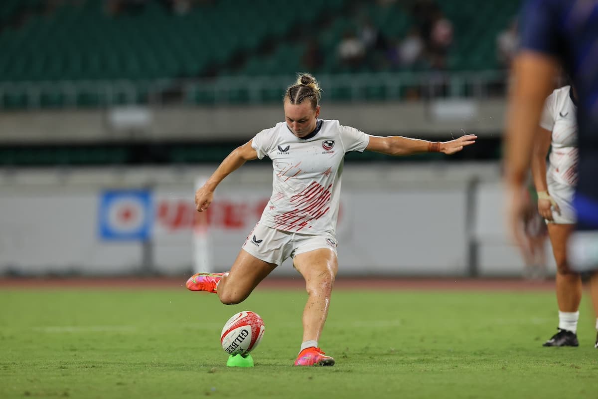 Undaunted, the Eagles worked hard to stay in Japan territory. Off a line out, the squad worked through many phases to get the ball over the try line, Japan’s defensive wall holding tight. Rachel Ehrecke finally pushed through enough to get the ball over, but a TMO check called no try, sending it back for Japan’s attack. But the USA remained calm in those final moments and worked back down field, where a penalty gave Hawkins another kicking chance, putting the USA up by three with a few minutes left in the match.